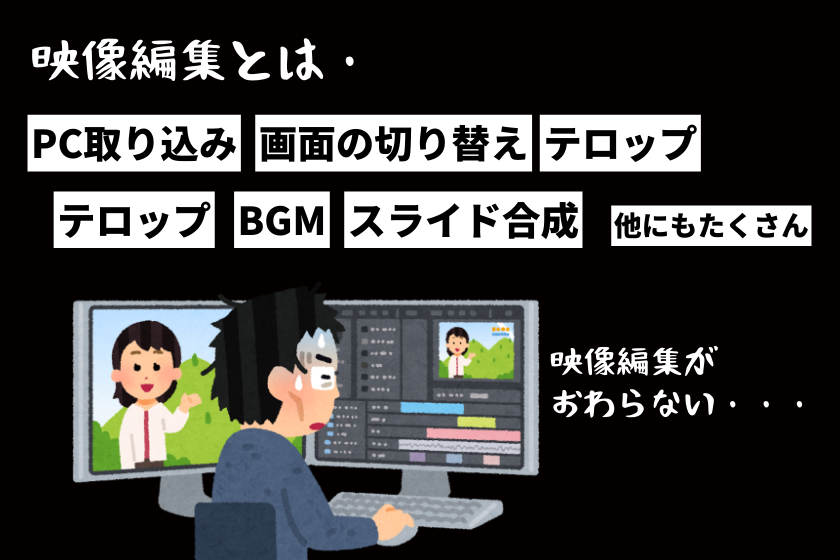 撮影した映像素材をPCに取り込み、不要な部分をカット、テロップを入れ、BGMを選び、効果音をつけ、画面の切り替えを調整し、スライド合成、色を補正する…。たった10分のセミナー映像でも、編集だけで丸一日、場合によっては数日かかることも珍しくありません。